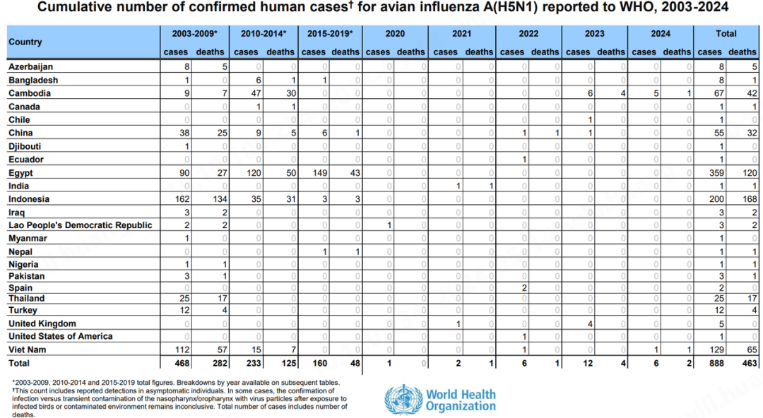 [1]WHO,https://cdn.who.int/media/docs/default-source/influenza/h5n1-human-case-cumulative-table/2024_feb_tableh5n1.pdf?sfvrsn=bccd8c23_1&download=true