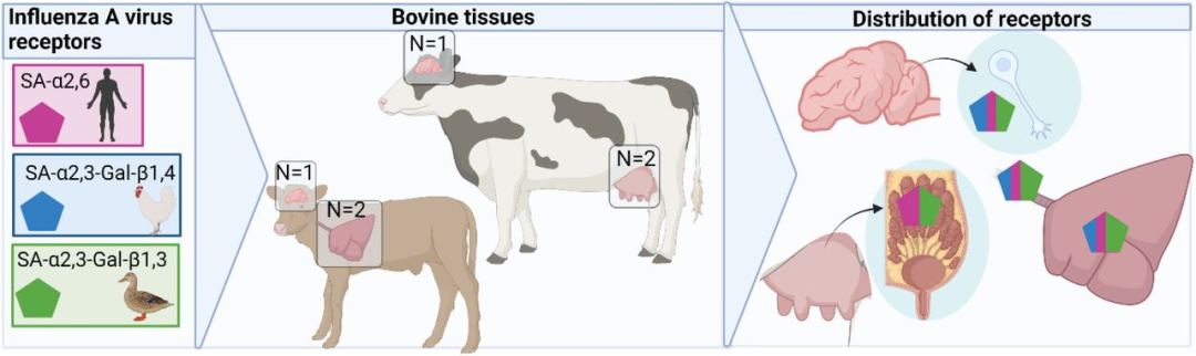 盡管針對(duì)美國(guó)發(fā)生的奶牛疫情相關(guān)的3例患者的基因分析都暗示著目前病毒仍然缺乏更適應(yīng)人際傳播的相關(guān)突變,目前對(duì)人類健康的風(fēng)險(xiǎn)仍然很低,但事實(shí)上H5N1現(xiàn)確實(shí)已經(jīng)在奶牛物種上實(shí)現(xiàn)了這種哺乳類動(dòng)物宿主的適應(yīng),且文獻(xiàn)表明4,奶牛的乳腺中含有相對(duì)較為豐富的SA-α2,3和SA-α2,6唾液酸受體,其分別是禽類和人類的甲型流感A病毒的主要受體,在牛的呼吸道中含量較少。這也解釋了為什么牛在呼吸道暴露時(shí)高度抵抗人類和豬源的甲型流感病毒感染,也意味著禽類和人類的病毒可以在牛乳腺中復(fù)制,并在適當(dāng)時(shí),??赡艹蔀榱鞲胁《局亟M的混合容器,從而加速H5N1的進(jìn)化,使其適應(yīng)人類,實(shí)現(xiàn)人與人之間的傳播5。