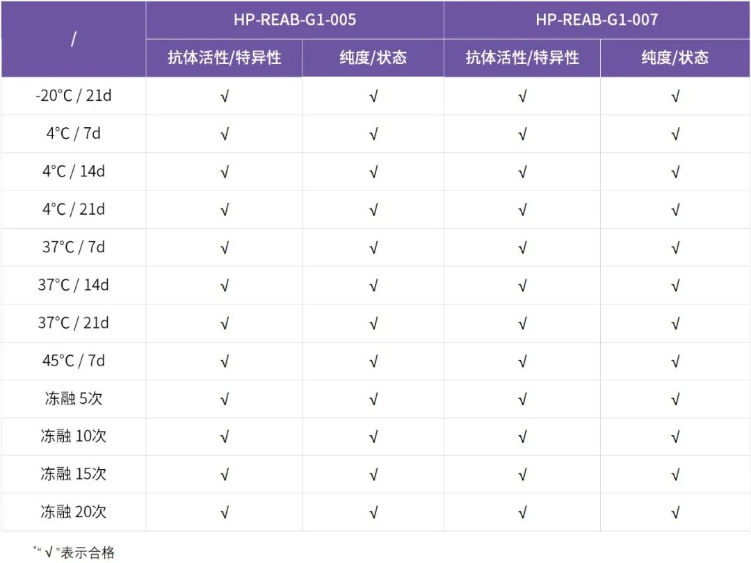 經(jīng)-20℃、4℃、37℃考核 21天,45℃考核7天,反復(fù)凍融20次考核后,對菲鵬生物兩株抗體HP-REAB-G1-005和HP-REAB-G1-007性能進行評估,結(jié)果顯示:兩株抗體活性均未出現(xiàn)下降的情況,表明以上抗體穩(wěn)定性良好。