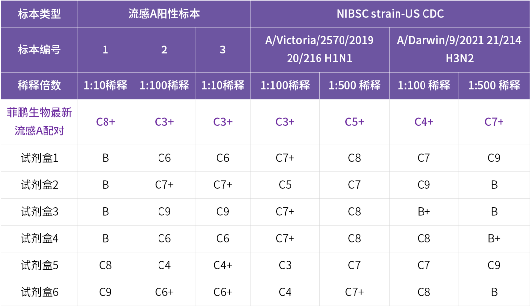 菲鵬生物流感A原料制備的試紙條與其他試劑盒對比數(shù)據(jù)