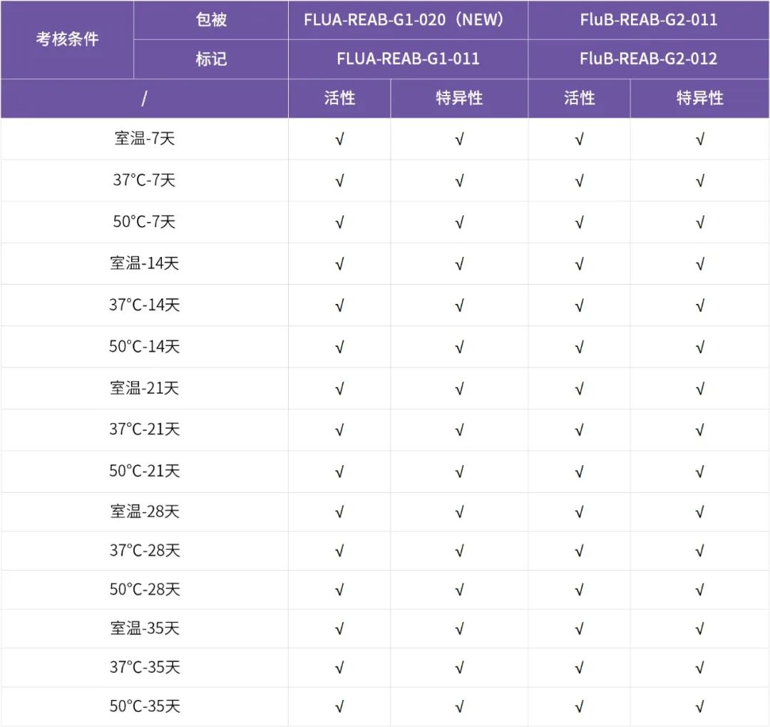 將菲鵬生物流感A與B配對產(chǎn)品在進行反復凍融、超低溫保存時間、不同溫度與不同時間進行考核后,產(chǎn)品物理性能無明顯變化,活性、特異性和交叉性均無變化,產(chǎn)品穩(wěn)定性優(yōu)良。