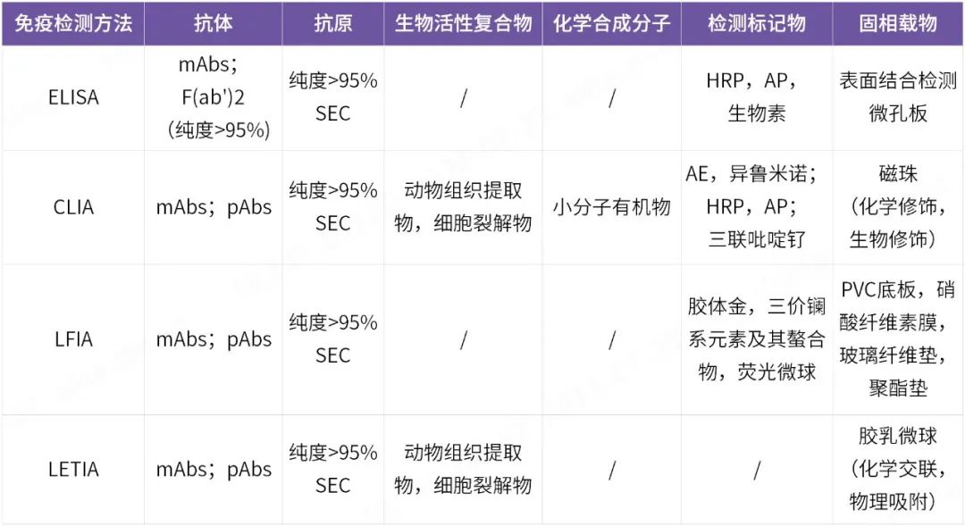 目前常用的免疫檢測方法包括四種:酶聯(lián)免疫吸附試驗(ELISA)、化學發(fā)光免疫分析(CLIA)、層析免疫分析(LFIA)、乳膠增強比濁免疫分析(LETIA),不同的檢測方法都遵循免疫反應的底層原理,即抗原抗體親和反應,不同檢測方法學對抗原抗體的應用方法不同,所以對抗原抗體的要求也不同。