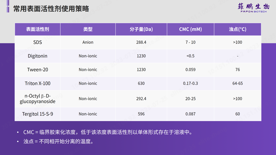 在提取過程中使用表面活性劑也是提高抗原或抗體活性和穩(wěn)定性的一種方法。菲鵬生物總結了不同表面活性劑的物理性質(如下圖),在使用過程中需要從溫度、類型、使用濃度、溶解目標和下游檢測影響等進行綜合考慮。例如:SDS是一種強陰離子表面活性劑,容易破壞蛋白,且難以去除,使用時需謹慎;Digitonin可溶解真核細胞膜,但不能溶解原核細胞膜;Triton X-100可溶解細菌內膜但不能溶解細菌外膜,此外,Triton X-100還能夠吸收紫外線,對下游檢測會有影響等。