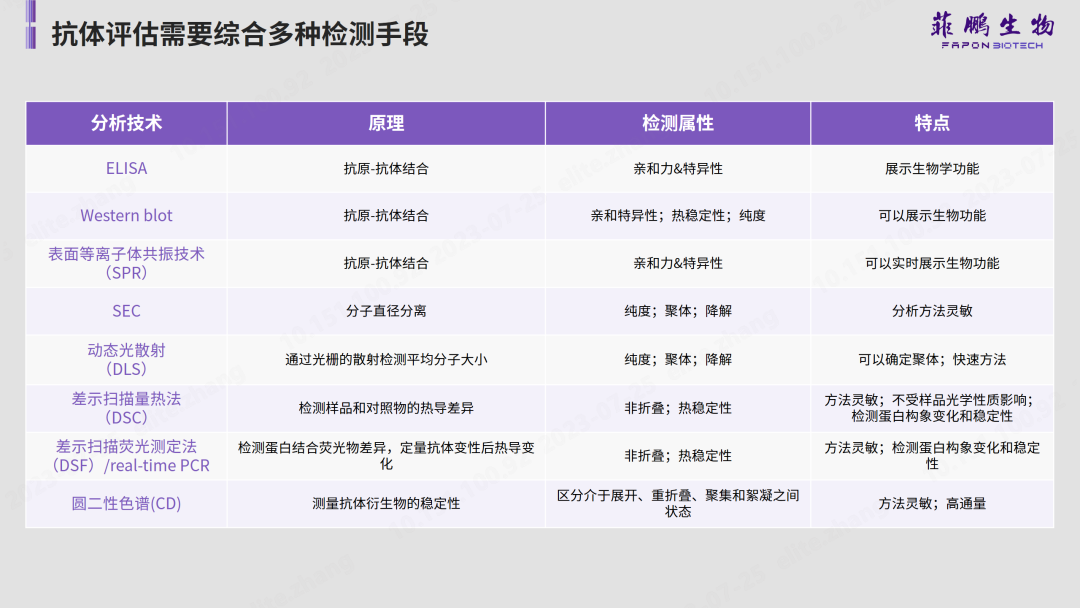 此外,抗體穩(wěn)定性評估還需要借助多種檢測手段來綜合分析。菲鵬生物總結了八種常用的抗體檢測技術,如通過表面等離子體共振技術(SPR)分析發(fā)現(xiàn),抗體的親和力能夠決定試劑檢測的靈敏度;動態(tài)光散射(DLS)可用于考察抗體的穩(wěn)定性;抗體純度可通過聚丙烯酰胺凝膠電泳(SDS-PAGE)、體積排阻色譜(SEC-HPLC)、十二烷基硫酸鈉毛細管電泳(CE-SDS)三種方式進行確認;毛細管等電聚焦電泳(CIEF)是檢測分析抗體電荷異構體的有效手段。