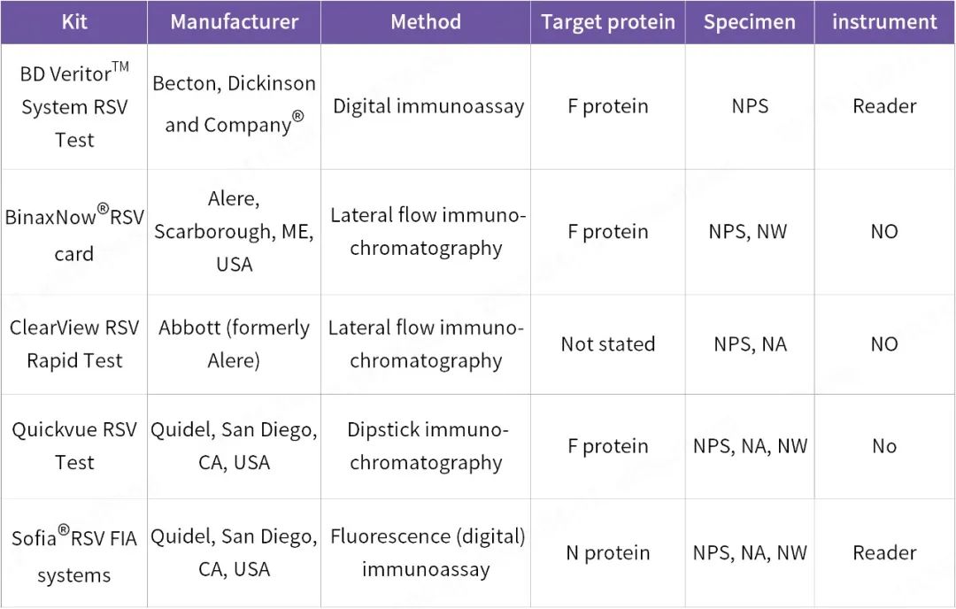 抗原檢測方法的靈敏度雖不及培養(yǎng)或核酸擴(kuò)增,但由于用時(shí)較短(10-15分鐘)的優(yōu)勢, 一般適用于急診的檢測場景,尤其是針對(duì)嬰幼兒人群,能夠起到及時(shí)阻斷病毒傳播的作用。目前國際上多家RSV快速抗原診斷試劑盒(RADTs)均已獲得美國臨床實(shí)驗(yàn)室改進(jìn)修正案(CLIA)的豁免,即非醫(yī)務(wù)人員也可自行使用和測試。在這些RADTs中,N蛋白和F蛋白的檢測標(biāo)靶均可見,采用的樣本類型一般兼容鼻咽拭子(NPS)、鼻咽吸取物(NPA)和鼻腔洗液(NW) ,其中NPS長期以來被認(rèn)為是首選的樣本。為提高RSV抗原檢測的敏感性和特異性,其中兩種商業(yè)上可用的橫向流動(dòng)測試還配備了數(shù)字掃描儀,詳見下表: