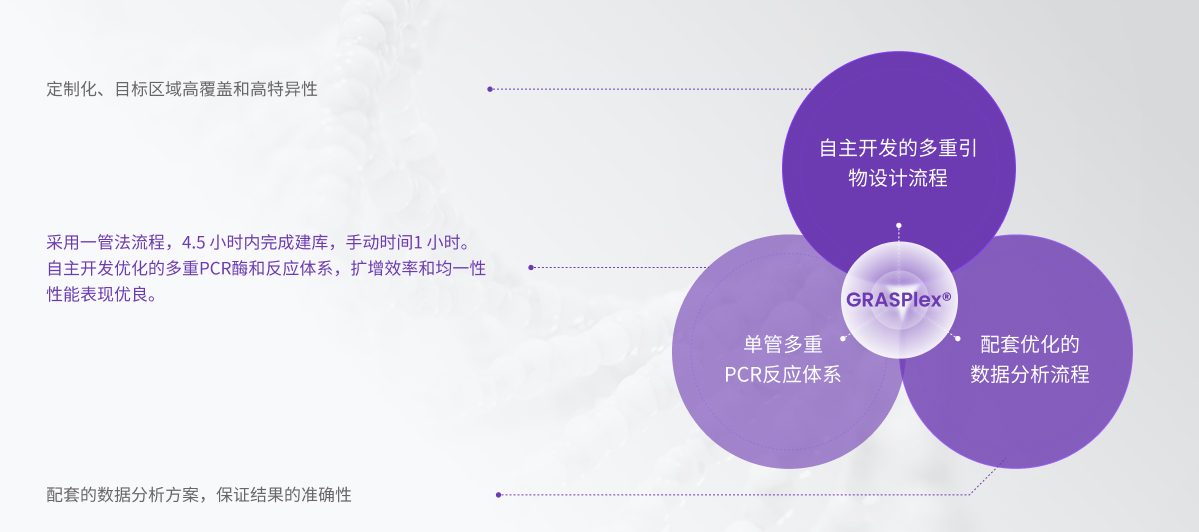 GRASPlex?多重?cái)U(kuò)增子靶向捕獲測序技術(shù)是菲鵬生物自主研發(fā)的一種高靈敏、超高效的目標(biāo)區(qū)域富集及建庫技術(shù)。首先利用多重PCR擴(kuò)增、均一地富集樣品基因組中目標(biāo)區(qū)域的DNA片段,再進(jìn)行文庫構(gòu)建,最后使用主流測序平臺進(jìn)行大批量樣本平行檢測與深度分析。